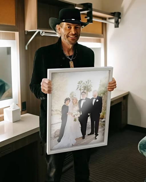One photograph captured that truth perfectly. In it, Keith stands holding the wedding portrait of his daughter, smiling with the unmistakable pride only a father can feel. There are no roaring crowds, no flashing lights—just a moment suspended in time. His expression says everything words cannot: after all the years of touring highways and headlining stadiums, this is the kind of victory that matters most.