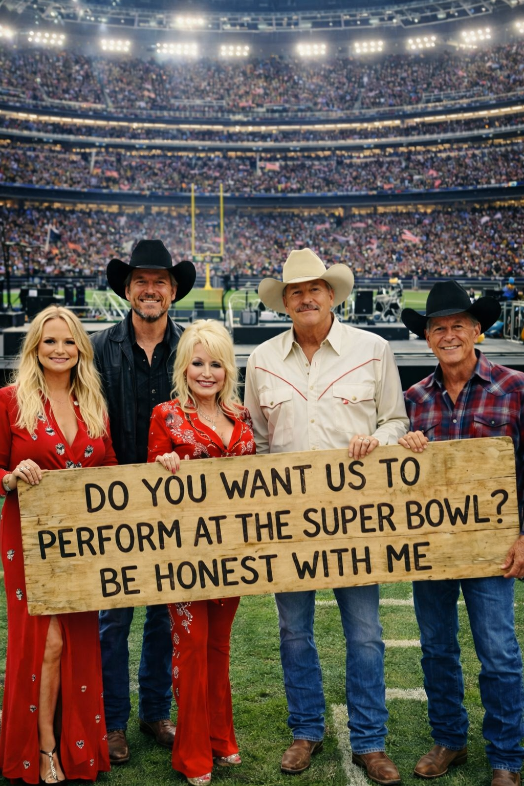 That’s exactly what’s happening with whispers of a potential Super Bowl halftime moment involving five towering figures of country music: Dolly Parton, Miranda Lambert, Blake Shelton, George Strait, and Alan Jackson.