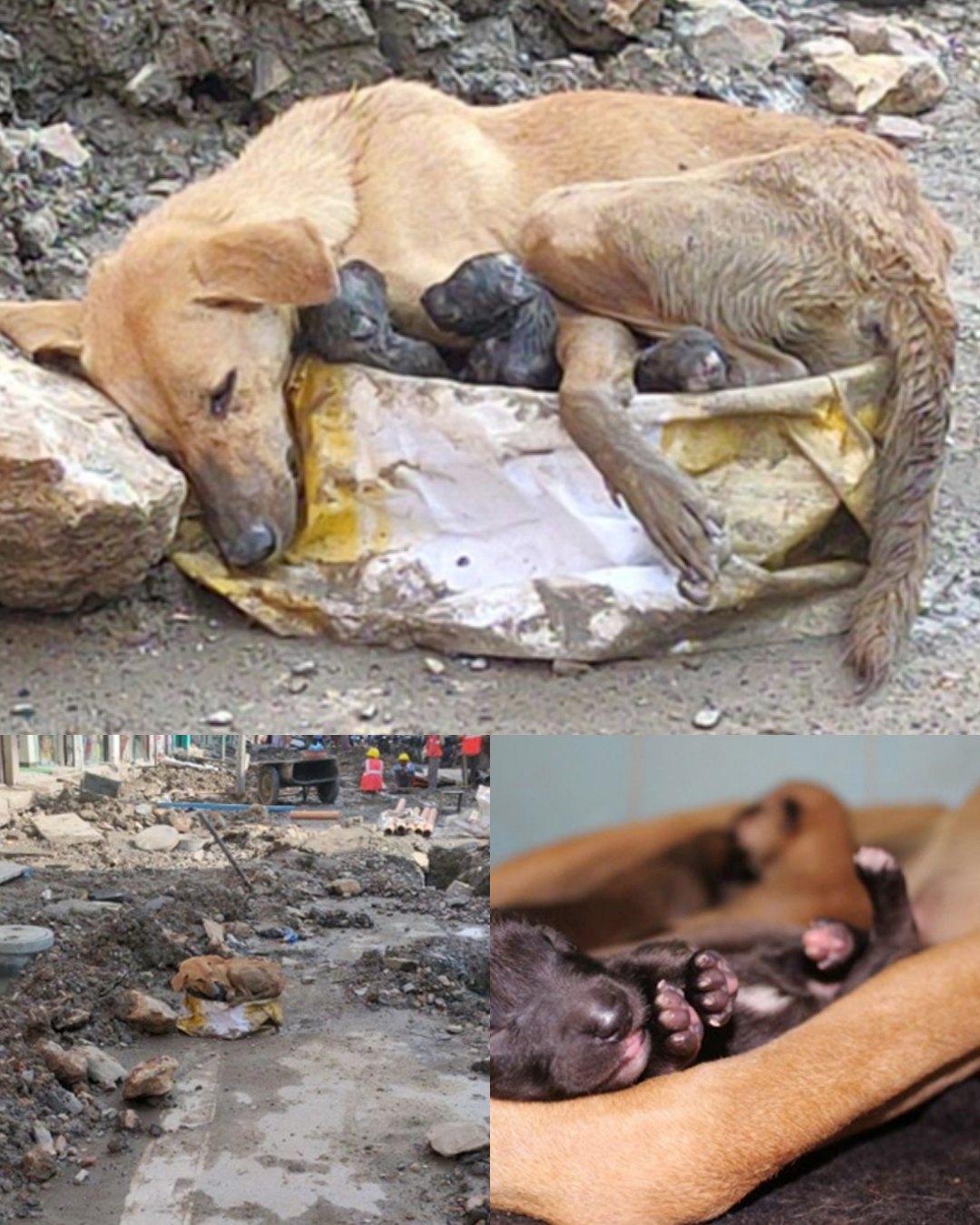 ToggleIn the middle of a dusty construction site in India—where the air trembled with the clang of steel and the grind of machinery—a silent battle for survival was unfolding. Beneath piles of broken concrete and scattered debris, a stray mother dog lay curled around her newborn puppies, shielding them from a world that had never been kind to her.