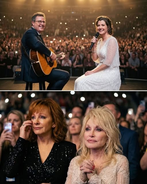 Vince Gill’s voice has always carried a certain tenderness—clear, steady, and rich with feeling. That night, it sounded lived-in, like a well-worn letter pulled from a drawer and read one more time. When Amy joined him, her voice floated in with that familiar clarity, still radiant, still full of grace.