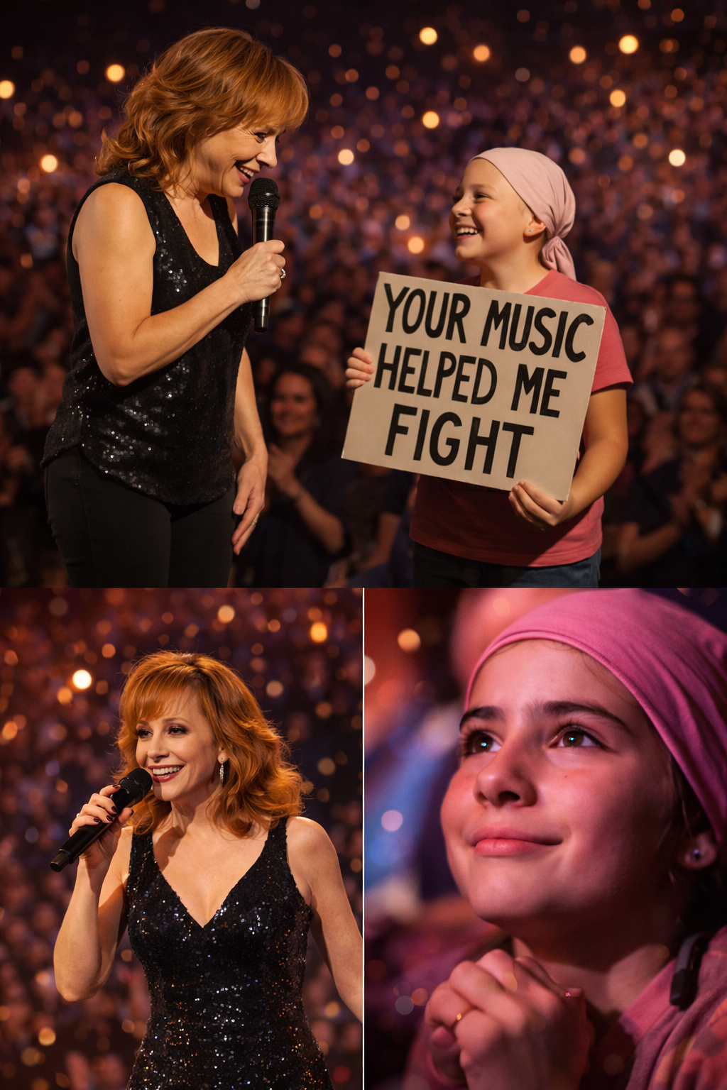 Amid the sea of excited faces, Reba’s attention was drawn to a girl wearing a headscarf, her presence both quiet and powerful. In her hands, she held a simple sign with a message that would stop the show in its tracks: “Your music helped me fight.”