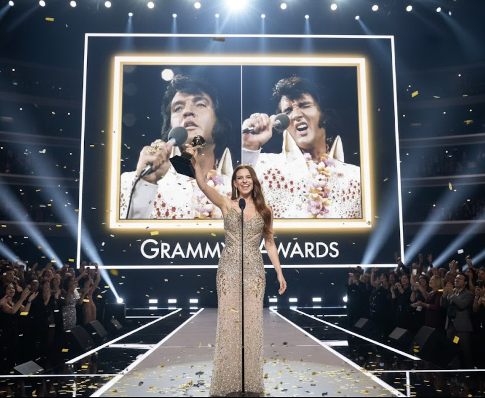 The air inside the Crypto.com Arena in Los Angeles felt charged with anticipation long before the announcement was made. When the GRAMMY for Best Vocal Performance was revealed, the crowd was already on its feet—an instinctive response fueled by history, reverence, and emotion. The award was not being accepted by a living nominee, but by Riley Keough, standing in for her legendary grandfather, Elvis Presley, and his newly unearthed ballad, “Shattered Sky.”