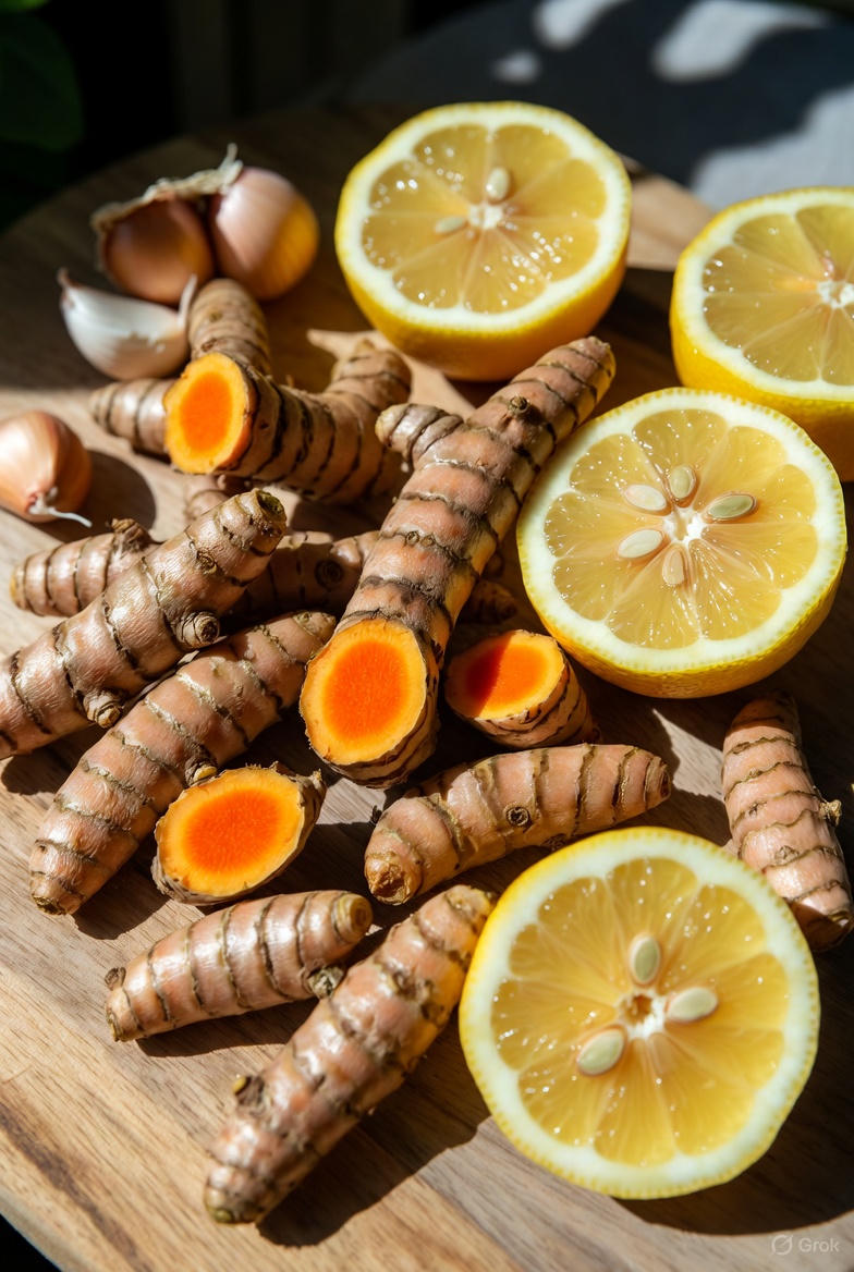Meta-analyses suggest curcumin may reduce oxidative stress. Garlic reviews point to benefits for healthy blood pressure. Lemon encourages better fluid intake while providing essential nutrients.