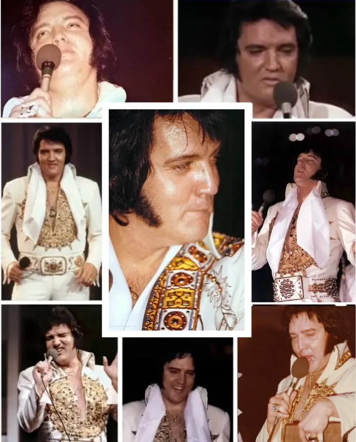 Yet instead of retreating from those imperfections, Elvis leaned into them. Rather than hiding the struggle, he performed through it, gripping the microphone stand as if the music itself was holding him upright.