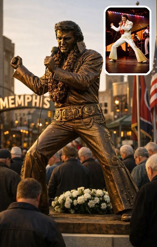 Yet recently, a story has quietly traveled across social media and fan communities: a rumored $2.8 million bronze statue honoring Elvis Presley has supposedly been unveiled in Memphis. Unlike typical monument dedications filled with speeches and camera flashes, the story paints a different scene—one of silence.
