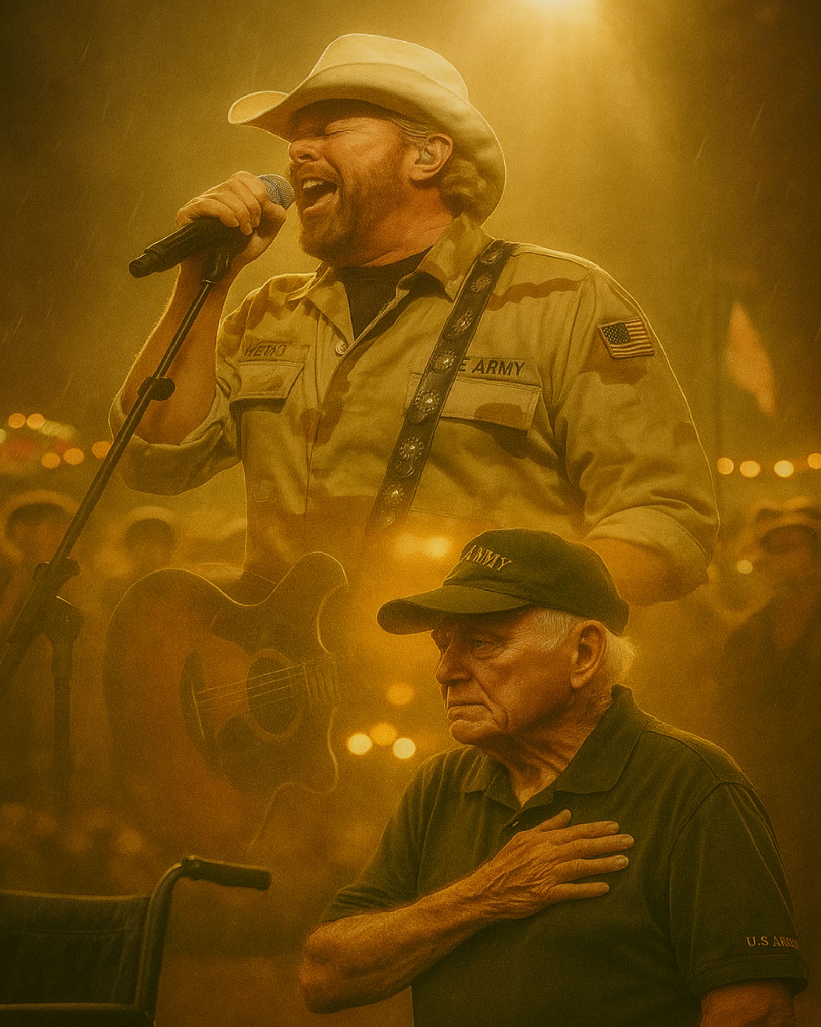 Halfway through “American Soldier,” Toby spotted something in the front row — an empty wheelchair. The man who’d been sitting there, a veteran with weathered hands and a proud stance, was now on his feet, his hand pressed firmly over his heart. Toby paused, eyes softening beneath the brim of his hat. The band stopped. The noise faded.