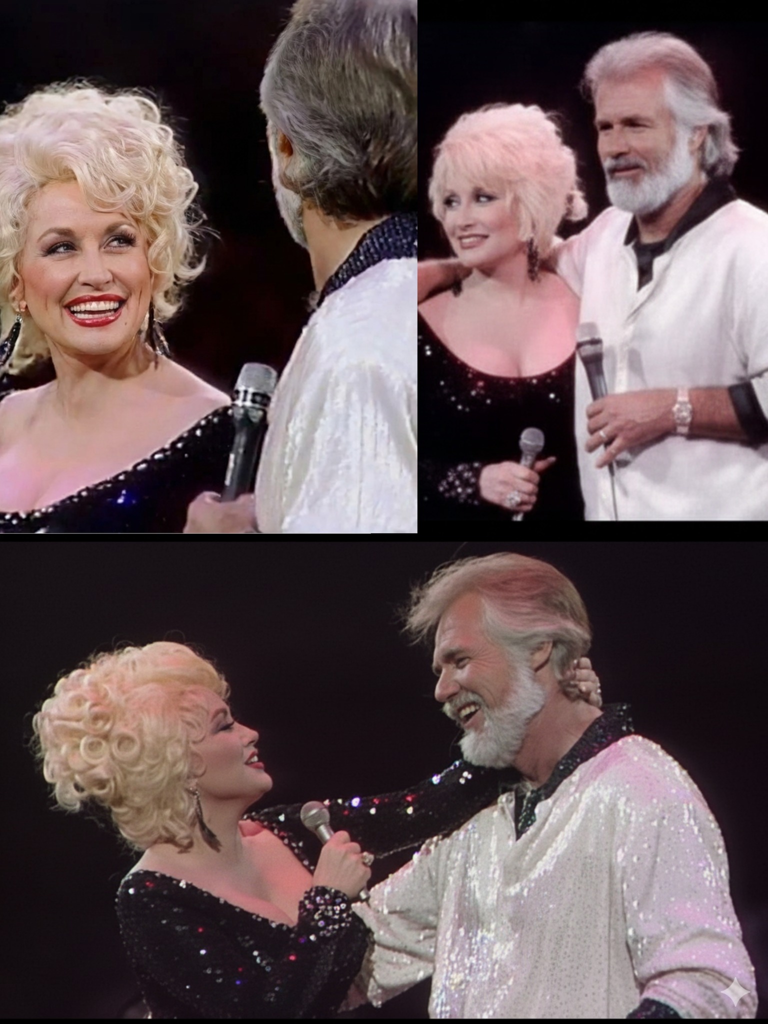 Visually, the stage presence reinforces the song’s meaning. There are no dramatic gestures, no theatrical movement. Kenny Rogers and Dolly Parton stand close, attentive to each other, as if sharing a private conversation rather than performing for a crowd. The audience becomes a witness rather than a participant, invited to listen rather than applaud.