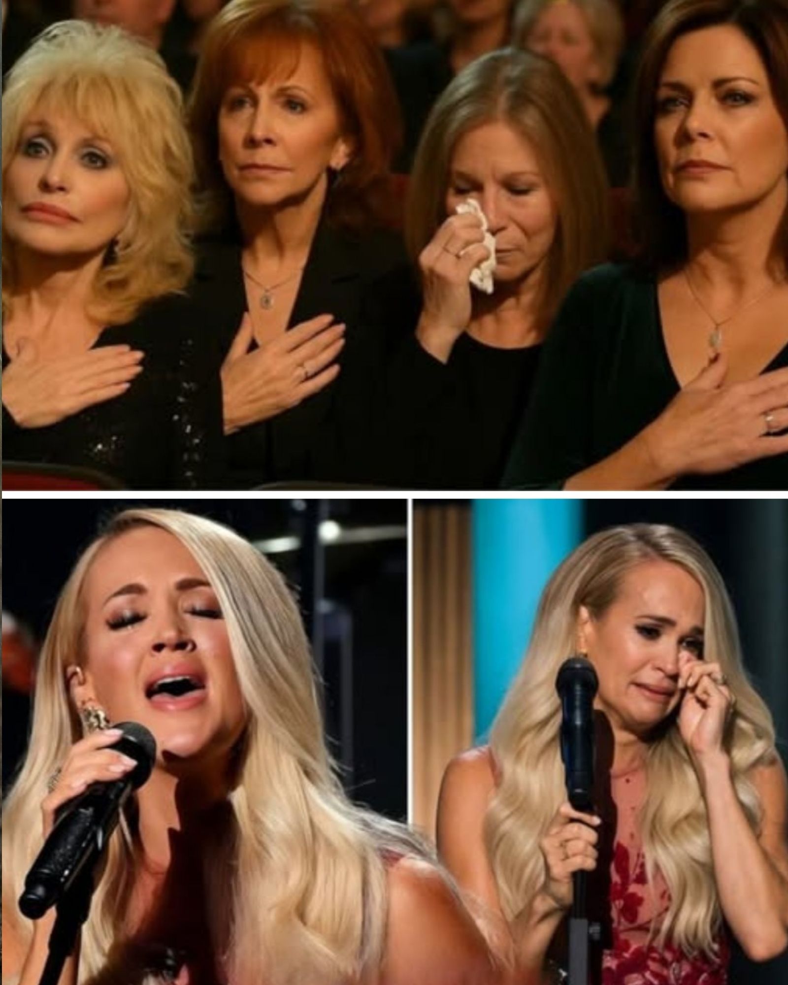Backstage, a quiet gathering of legends formed: Dolly Parton, Reba McEntire, Barbara Mandrell, and Martina McBride. No spotlight, no fanfare — just four icons watching the monitor, their eyes fixed on Carrie. Sources say their reactions were filled with awe: a hand over a heart, a whisper of disbelief, tears glistening. When Carrie reached the soaring chorus of Martina’s “A Broken Wing”, Barbara leaned toward the others and whispered with a smile: “That’s our girl.”