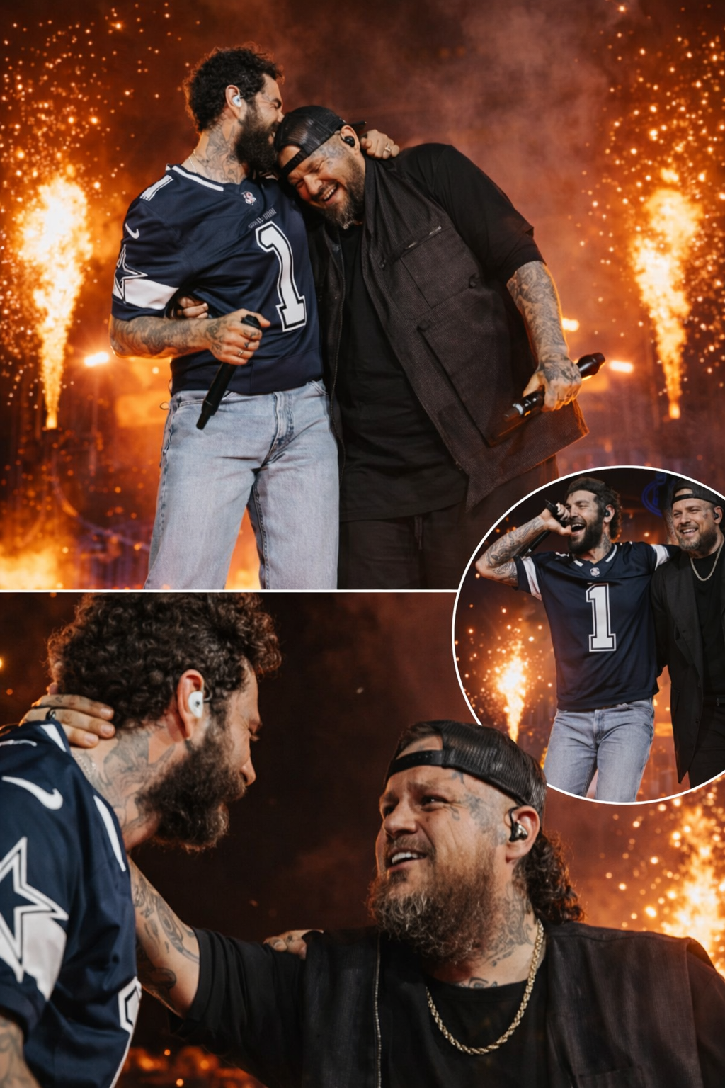 The first notes rang out, fragile and haunting, as Post Malone’s gravel-edged tone cut through the stillness. There were no dancers. No pyrotechnics. No elaborate stagecraft. Just two men, standing under a single beam of light, sharing a story only they could tell. When Jelly Roll joined, his voice thundered through the arena, imperfect yet mesmerizing, raw but undeniably powerful. What they created together transcended performance — it became a shared catharsis, a moment of empathy, a musical exhale.