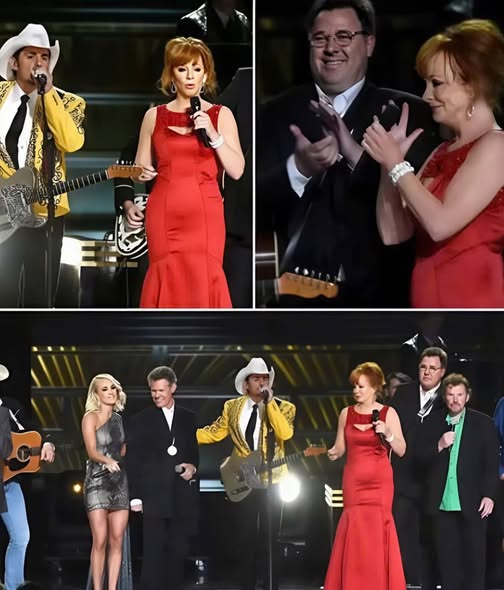 Reba McEntire stood nearby, her presence warm and grounding, offering a gentle nod that carried decades of experience and quiet confidence. Brad Paisley, ever the storyteller, wore a grin that felt less like showmanship and more like someone returning home. And Carrie Underwood—poised, powerful—closed her eyes as if to let every lyric pass through her before it reached the audience.