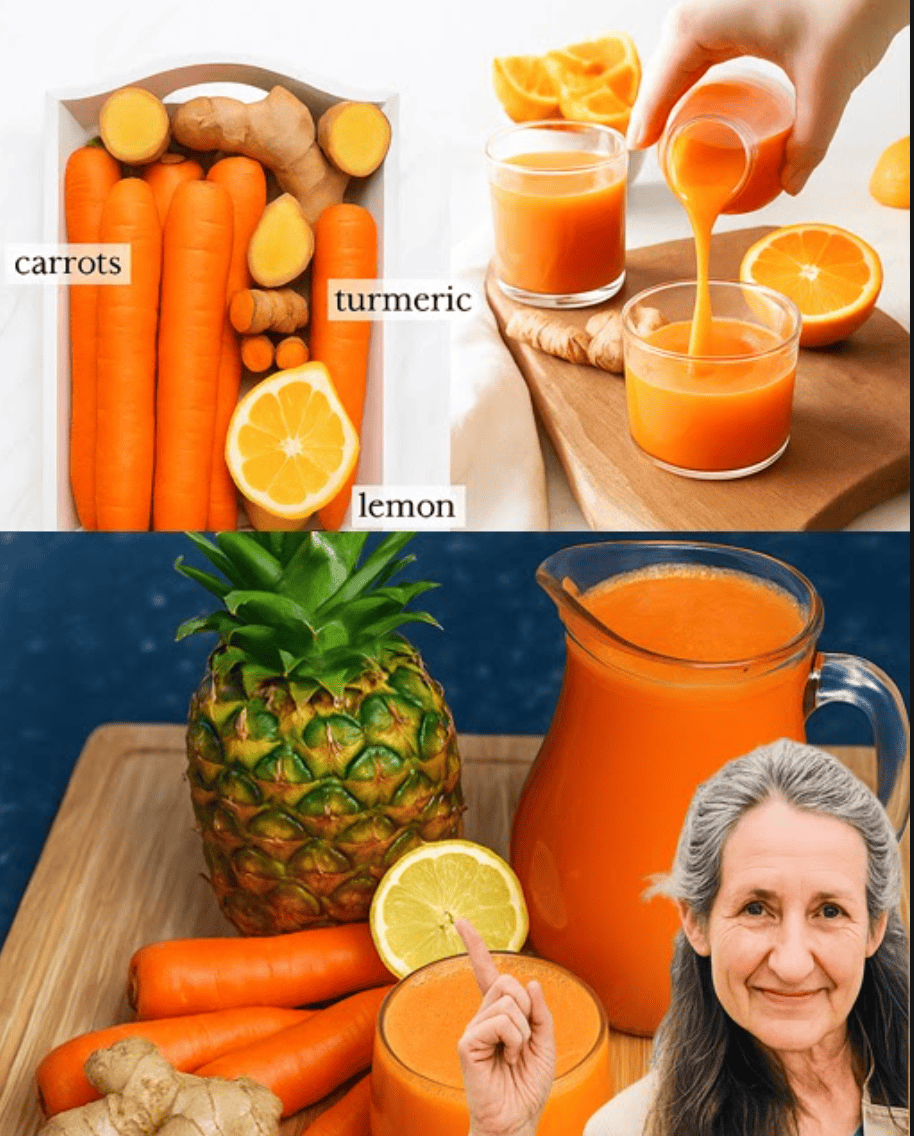 Look at the images—vibrant carrots, zesty lemons, spicy ginger, golden turmeric, and sweet pineapple blending into a bright orange juice. At today, discover how this delicious drink can transform your health. It’s a simple recipe that promises energy, immunity, and a glow from within.