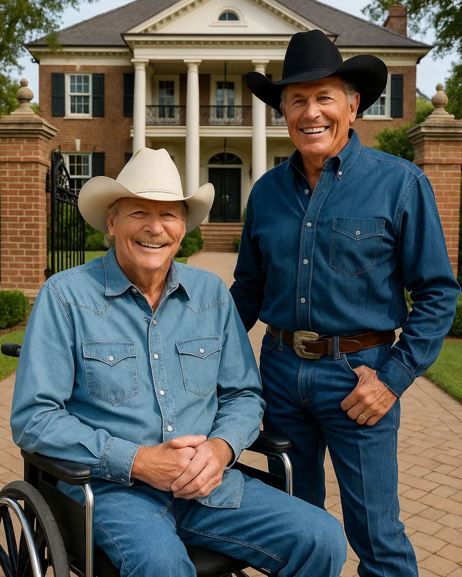 But as tributes poured in, one gesture stood apart from the rest. Late yesterday afternoon, George Strait — Jackson’s old friend and brother in country — pulled up quietly to Alan’s Tennessee home. No cameras, no reporters, just a man with a guitar and a heart full of respect.
