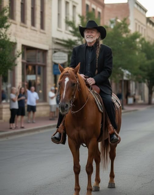 No cameras trailed him. No security detail cleared the street. There was no publicity team, no announcement, no viral stunt unfolding in real time. Just Willie, dressed in his familiar dark jacket, sitting relaxed in the saddle with the easy posture of someone who has spent a lifetime around open roads and wide Texas skies.