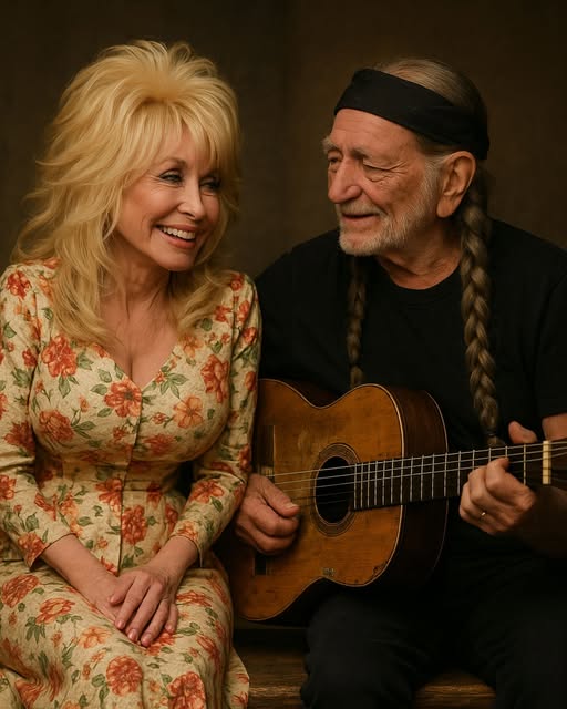 Dolly sat comfortably in a wooden chair, dressed in one of her signature floral outfits, her blonde hair glowing under the warm light of a single lamp. Across from her, Willie leaned back with his guitar resting easy in his hands, his familiar braids falling over his shoulders. His eyes held that timeless blend of humor and depth—the look of a man who has lived a thousand songs.