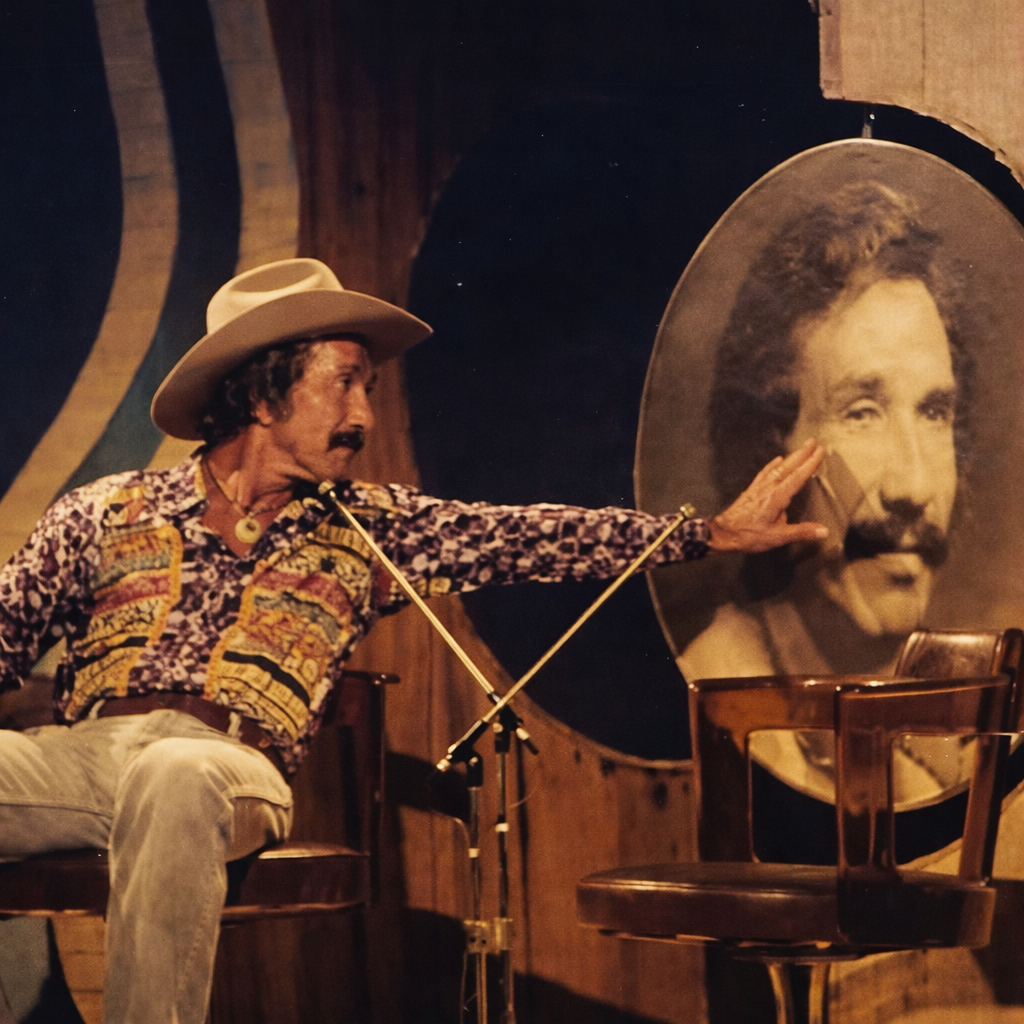 There are rare moments in music when everything seems to pause—when the lights, the stage, and even the passing of time itself feel secondary to something far more human. In one unforgettable image, Marty Robbins leans forward, gently placing his hand on a towering portrait of himself. It is not a gesture of ego or self-celebration. Instead, it feels like a quiet conversation between a man and his own past.