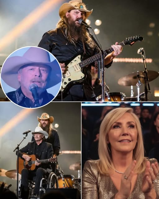 The room was already electric. Fans had gathered with the quiet hope that they might see a living legend appear, even briefly. Then, from the wings, a wheelchair rolled into the glow. Seated in it was Alan Jackson—thinner than the stadium posters from decades past, hands trembling slightly, eyes still warm with that familiar, steady kindness that has carried his songs into countless homes for nearly half a century. The crowd went still. Some people cried before he reached the stage. Others stood without realizing they had risen. It wasn’t spectacle. It was recognition.