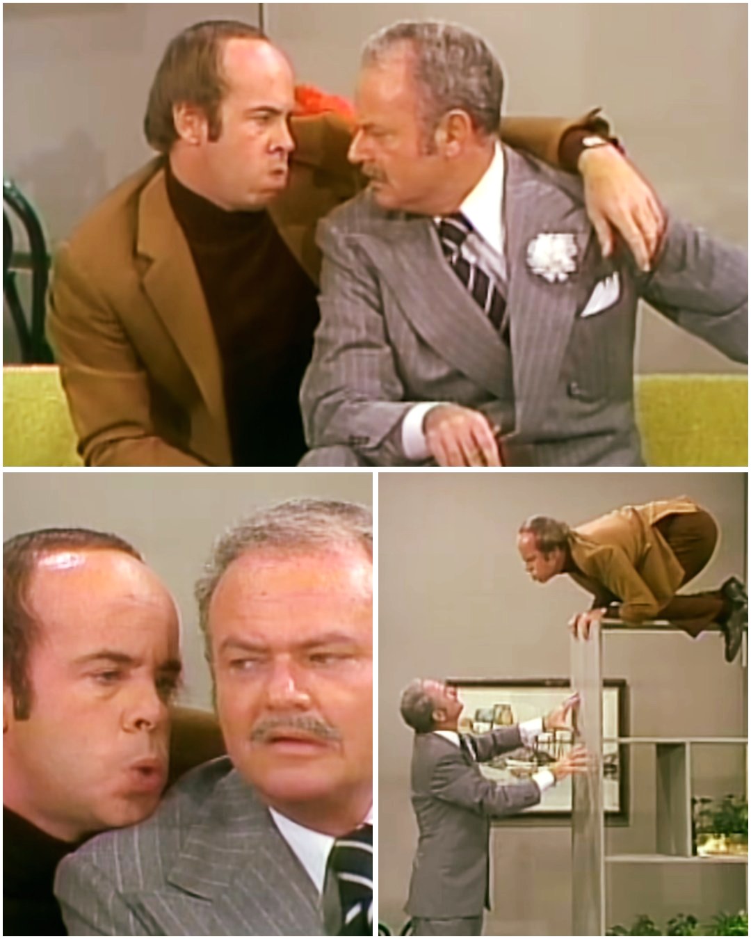 What makes the scene legendary isn’t just the physical comedy—though Conway’s animal-like movements are astonishingly precise—but the contrast. Harvey Korman continues asking serious, logical questions as if nothing unusual is happening. Carol Burnett, meanwhile, fights a losing battle to keep her composure, clutching her chair, bending over, and desperately trying not to dissolve into laughter.