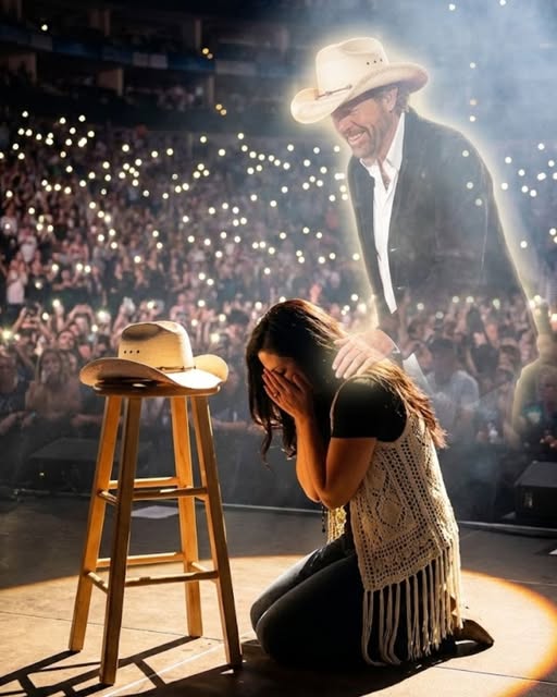 Krystal walked onto the stage slowly, hands trembling at her sides. She didn’t wave. She didn’t smile. She didn’t even reach for the microphone. She stood beside her father’s empty spot, as if even stepping too close would make the reality unbearable. Then, quietly, the band began the opening chords of “Should’ve Been a Cowboy.” The song’s familiar melody resonated across the arena, but Krystal didn’t sing. Instead, she whispered—to the empty air beside her, to the father she had lost. And then, the unthinkable happened. Her knees gave way. She fell beside the stool, hiding her face in her hands.