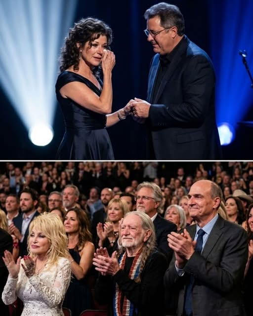 One such moment unfolded quietly in the heart of Nashville, where Vince Gill and Amy Grant—two of country music’s most celebrated voices—shared a scene that could only be described as sacred. Surrounded by legends whose names alone fill arenas, Vince reached for Amy’s hand. It was a simple gesture, instinctual, familiar. Yet in that small movement, decades of shared life and music spoke louder than any microphone. The room, filled with giants of the genre, fell still. No one tried to outshine the moment. The silence itself became the performance.
