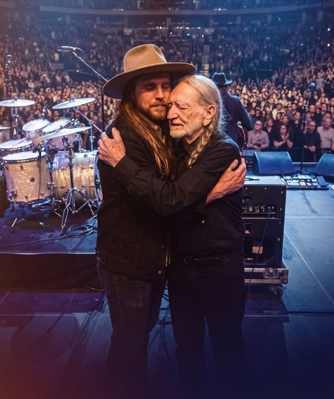 In the world of live music, audiences often expect spectacle—towering screens, roaring amplifiers, fireworks exploding into the night sky. Yet sometimes the most unforgettable moments arrive quietly, without warning, carried not by noise but by truth. That is exactly what happened when country legend Willie Nelson stepped onto a brightly lit stage with his son, Lukas Nelson. What followed was more than a performance. It became a rare, intimate moment that transformed a packed arena into something closer to sacred ground.