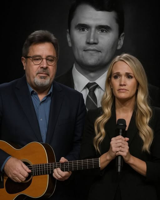 Vince Gill walked with his acoustic guitar pressed close to his chest, not like a tool, but like something sacred — a companion through decades of songs, losses, and hard-earned wisdom. Carrie Underwood followed, gripping the microphone with hands that visibly trembled. Her head was lowered, her expression unguarded. In that instant, neither appeared as superstars. They were mourners.