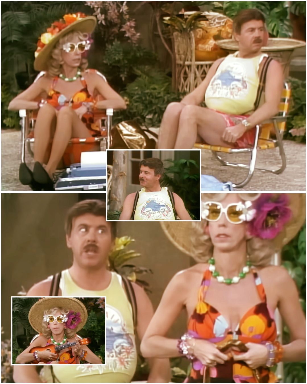 Carol Burnett enters as the wife — confident, flamboyant, sporting a blazing floral swimsuit and an outrageously oversized sunhat that practically becomes a character of its own. She radiates cheerful obliviousness… or perhaps calculated awareness.