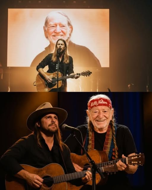 There are moments in music that feel suspended in time — instances when the familiar strings of a guitar carry more than melody, when every lyric seems to echo memories, lessons, and love. One such moment unfolded this week as Lukas Nelson, son of the legendary Willie Nelson, stepped onto a dimly lit stage with an old guitar that once belonged to his father. The audience had come expecting a performance, but what they witnessed was something far more intimate: a living testament to a family’s bond, passed not through words, but through song.