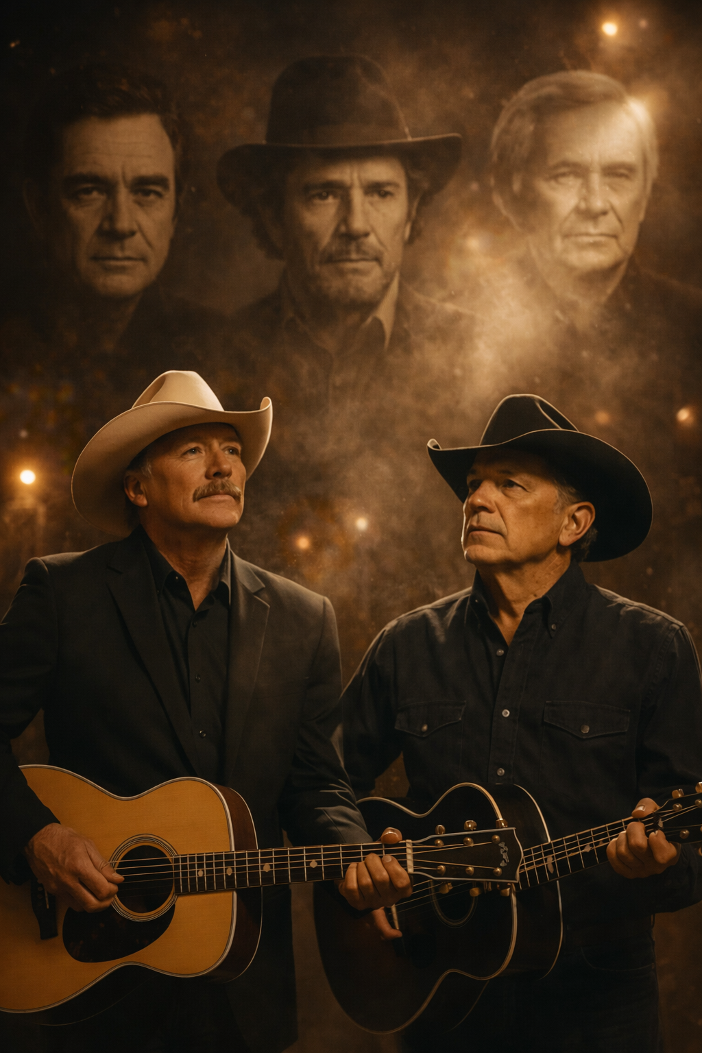 There are nights in Nashville that linger long after the final chord fades, moments where music isn’t just heard—it’s felt, breathed, and remembered. One such night unfolded under the soft glow of stage lights, when two of country music’s giants—Alan Jackson and George Strait—stepped into a shared history, making every heartbeat in the audience pause.