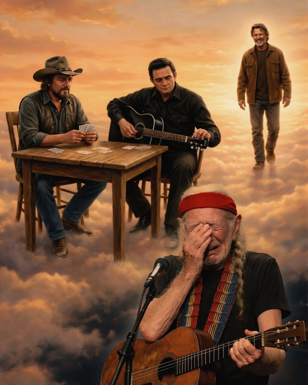 At a worn wooden table sitting somewhere in the clouds, Waylon Jennings shuffled a deck of cards with the casual confidence of a man who had spent his life on the road.