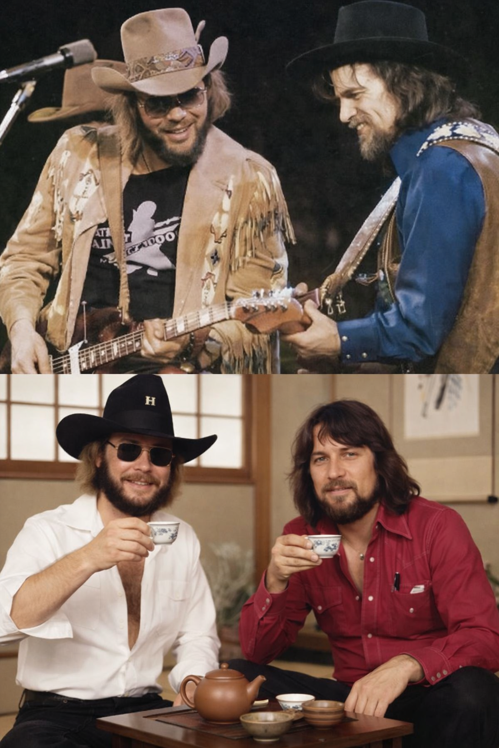Waylon’s deep, steady drawl carried the weight of experience. Every line he delivered felt deliberate, like he was carving it into the air. Then Hank Jr. came in with his signature growl — rough, rebellious, and unapologetically loud.