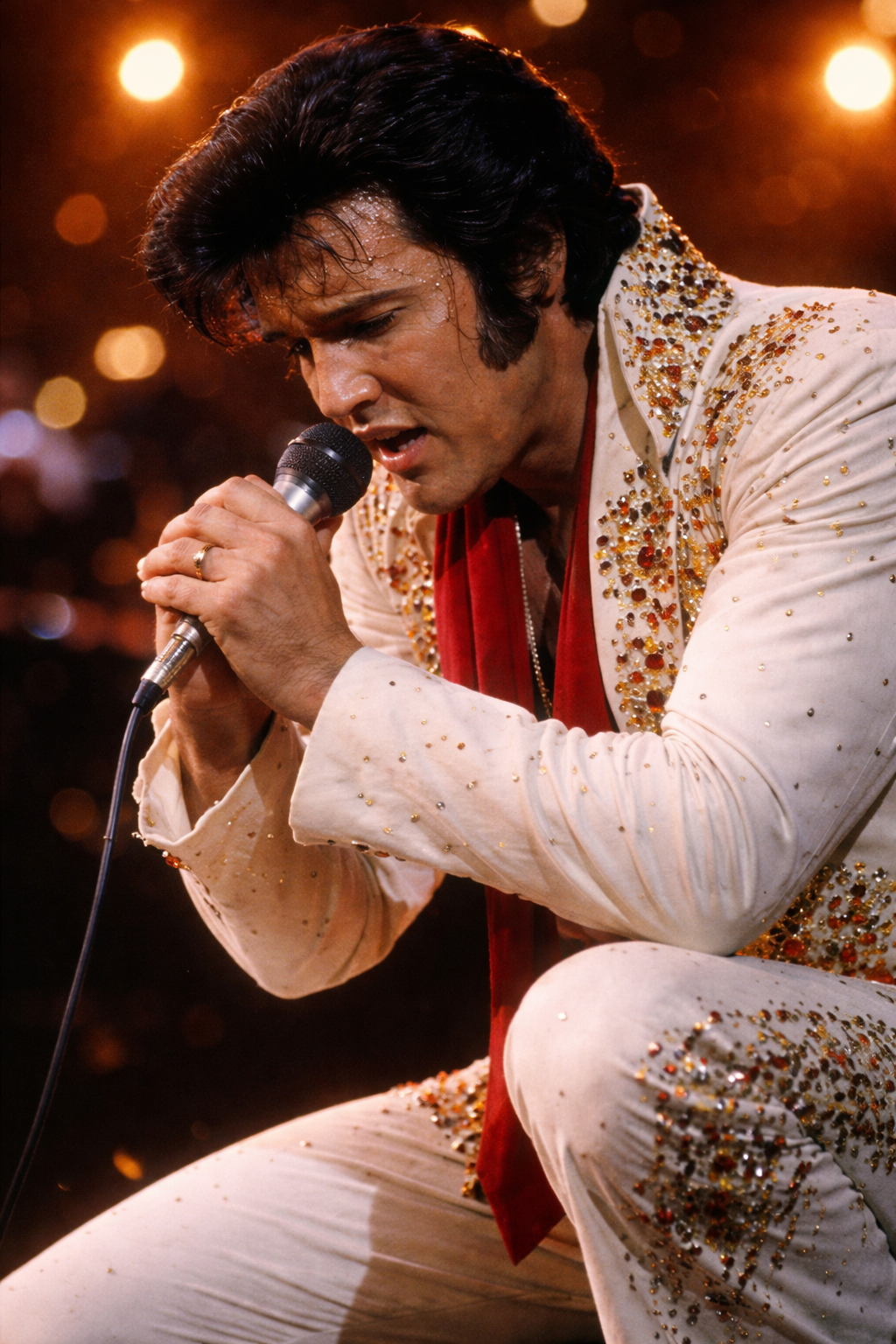 There is a particular image that lingers in the minds of fans who’ve revisited those late-era performances: Elvis on his knees, drenched in stage light, gripping the microphone as though it were the only stable thing in the room.