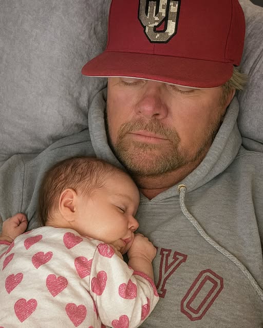 For Toby Keith, one of country music’s most recognizable voices of grit, pride, and red-white-and-blue bravado, that enduring image isn’t necessarily a roaring crowd or a fist-pumping anthem. It’s something far more intimate: a grandfather in an Oklahoma hoodie, eyes closed, gently holding a sleeping baby against his chest. No stage. No microphone. No applause. Just stillness.