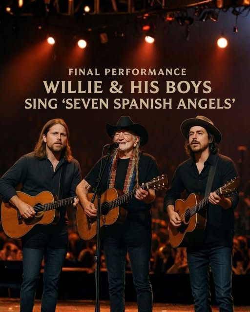 That’s what unfolded when Willie Nelson stepped into the warm amber glow of the stage with his sons, Lukas and Micah, and began the opening notes of “Seven Spanish Angels.” No fireworks. No dramatic introduction. No spotlight theatrics sweeping across the crowd.